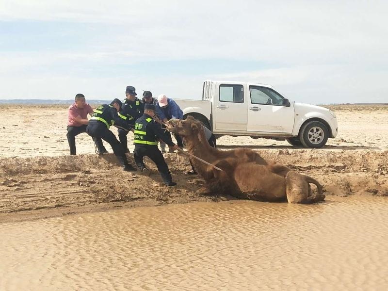 無獨有偶。當日下午,阿拉善左旗蘇宏圖邊境派出所也接到群眾報警:稱其一峰駱駝陷入泥潭無法脫身,請求救助。民警趕到現(xiàn)場后發(fā)現(xiàn)這是一峰懷孕母駝,在飲水時不慎滑入泥潭,由于浸泡許久,已經(jīng)無法站立。民警當即采取措施,在避免肚子受傷害的前提下,將兩條繩子分別固定在駱駝前肢與后肢,再利用人力拖拽,經(jīng)過2個小時的救援,成功將母駝救出。(牛鑫 梁鎮(zhèn) 于鶴偉)
