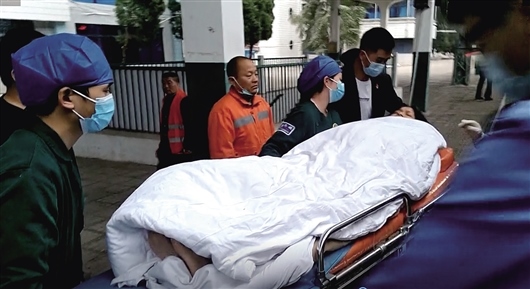 在江西信豐站臨時??績煞昼?,大家協(xié)力將產(chǎn)婦和新生兒抬到120急救車上,送往醫(yī)院進(jìn)一步治療。(圖片由劉晶新提供)