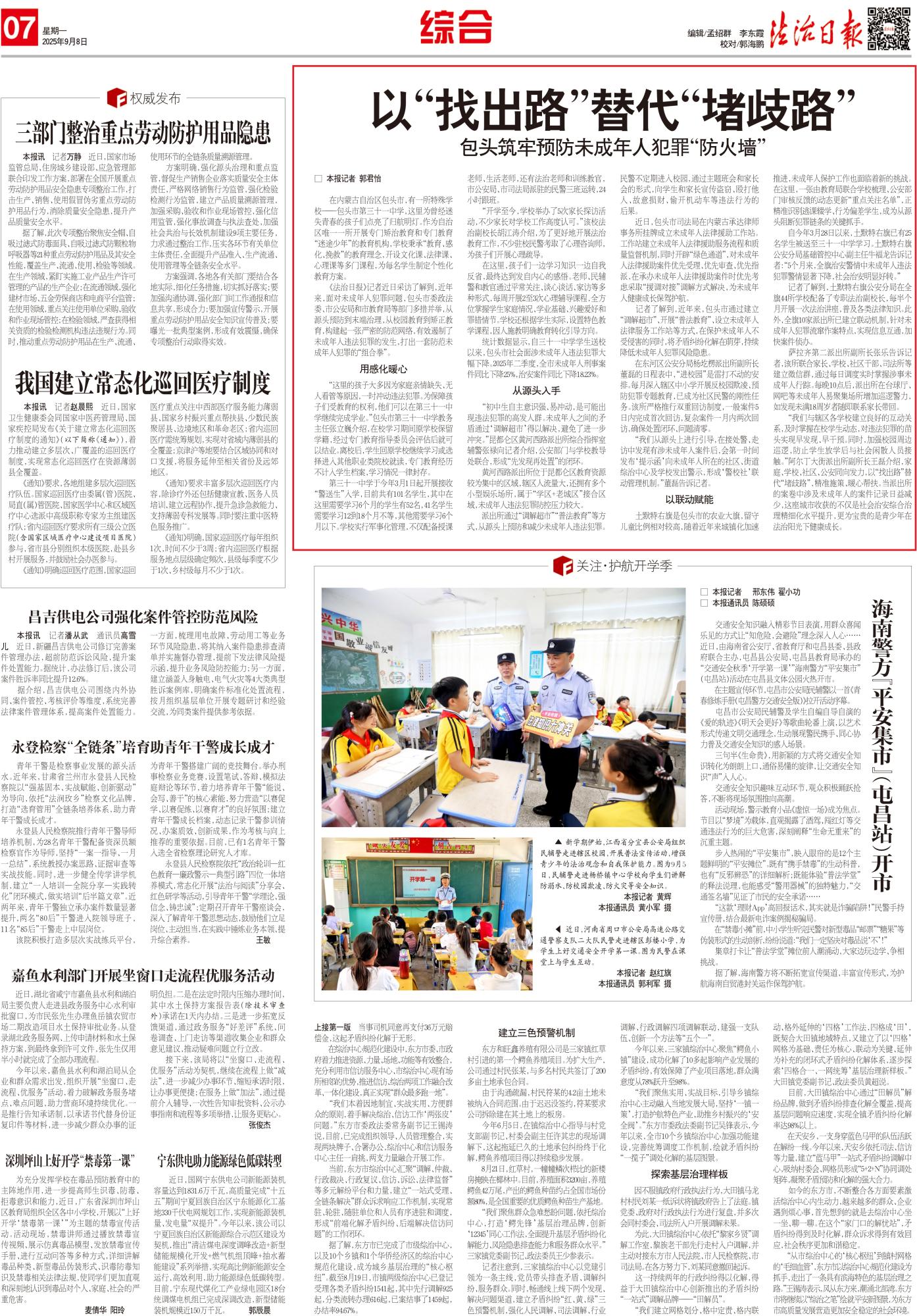 2025年9月8日,《法治日?qǐng)?bào)》第7版整版刊發(fā)題為《以“找出路”替代“堵歧路” 包頭筑牢預(yù)防未成年人犯罪“防火墻”》的文章,報(bào)道了近年來(lái),面對(duì)未成年人犯罪問(wèn)題,包頭市委政法委、市公安局和市教育局等部門(mén)多措并舉,從源頭預(yù)防到末端治理,從校園教育到矯正教育,構(gòu)建起一張嚴(yán)密的防范網(wǎng)絡(luò),有效遏制了未成年人違法犯罪的發(fā)生,打出一套防范未成年人犯罪的“組合拳”。