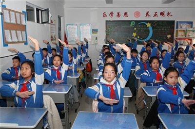 12月29日,臨河九小六年級的學(xué)生在下午第一節(jié)課課間,伴隨著音樂在教室座位上展示自編自排的創(chuàng)意操。圖為六(5)班同學(xué)們跟著歌曲《精忠報國》的節(jié)奏,或扭肩、或拍手,鏗鏘有力的歌聲激起了同學(xué)們“報效祖國,振興中華”的豪情壯志。針對課間時間短、下樓活動不方便等現(xiàn)狀,今年10月,臨河九小推出了課間創(chuàng)意操,每個班做的操不一樣,創(chuàng)意操一般在3分鐘之內(nèi)就可做完。(記者 張靜 楊曉軍 攝影報道)