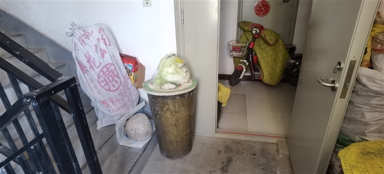 10月18日,記者在嘉和園3號樓1單元看到,有2輛電動車及3輛自行車停放在1樓大廳內,空間很窄,側身才能通過步梯門。一輛兒童自行車放置在1樓步梯口,車身布滿灰塵,旁邊放著桌子、鐵柜、木板等;2樓沒有樓梯間,較干凈,無雜物堆放現(xiàn)象;記者來到3樓看到,鐵柜、菜甕、裝滿物品的麻袋、石頭等雜物堆積在樓梯口,還有部分雜物直接蔓延到了樓梯臺階旁……