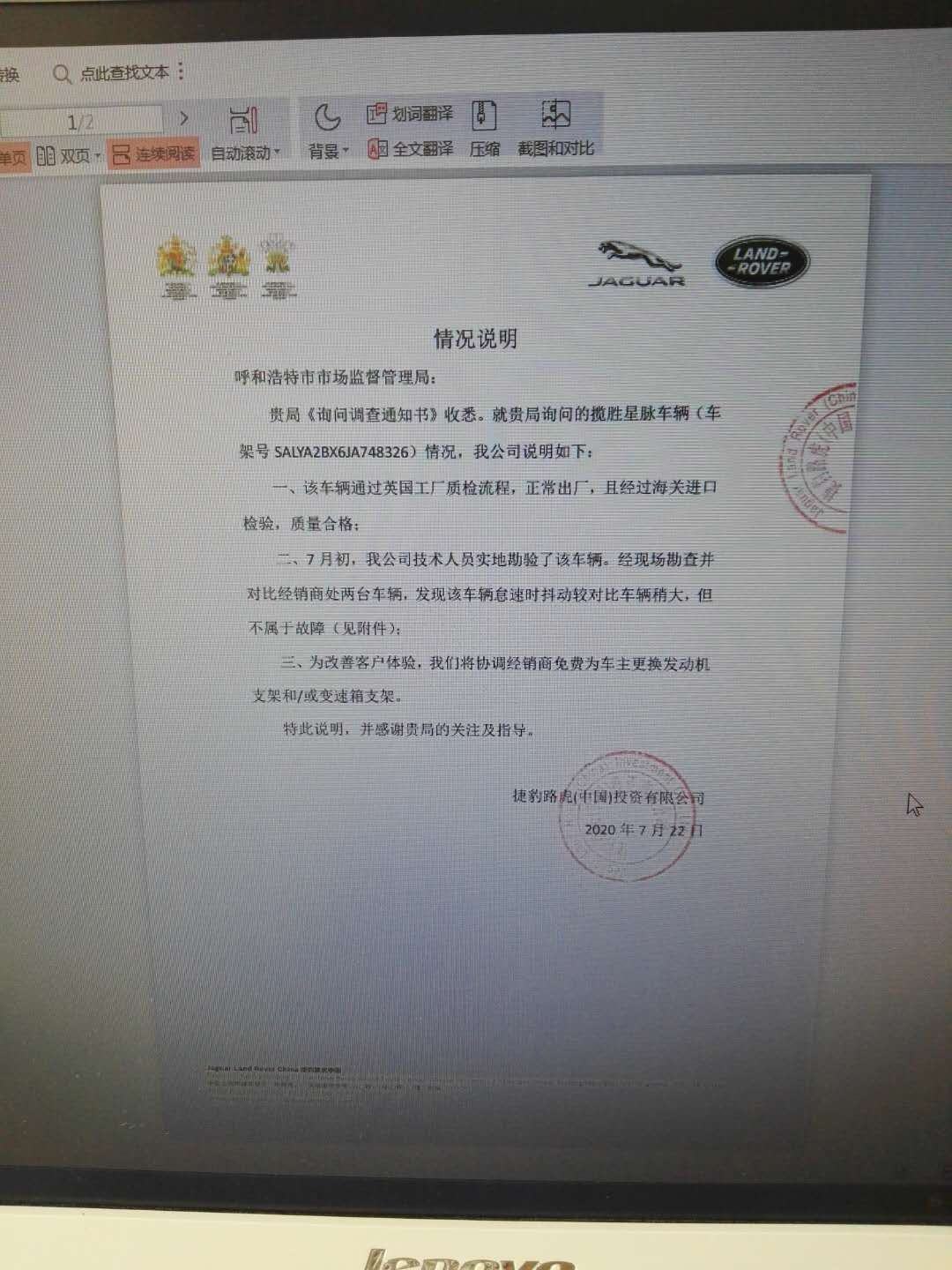 在多個車輛專區(qū)的貼吧里,均有關(guān)于該車型抖動,共振的情況反映。2019年,杭州30多名路虎星脈車主因為車輛共振導致耳鳴的問題,還共同趕到路虎上??偛考w維權(quán)。此事經(jīng)杭州媒體全程曝光,引起廣泛關(guān)注。盡管如此,捷豹路虎(中國)投資有限公司給出的答復和此次給呼和浩特市市場監(jiān)督管理局的《情況說明》如出一轍,都表示非質(zhì)量問題。