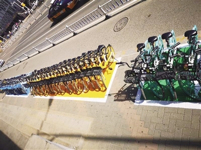 7月23日上午,記者來到呼和浩特火車站門前,遠遠就被火車站東側馬路道牙上的多彩顏色所吸引。原來這里被畫上了藍色、綠色和黃色的停車區(qū)域,一排排各品牌共享單車也根據(jù)車身顏色有序停放著。