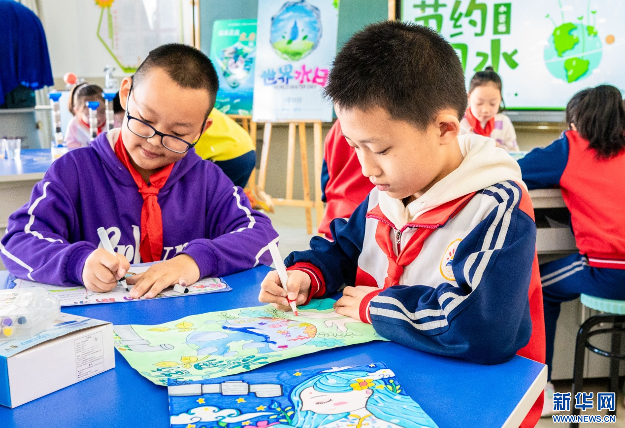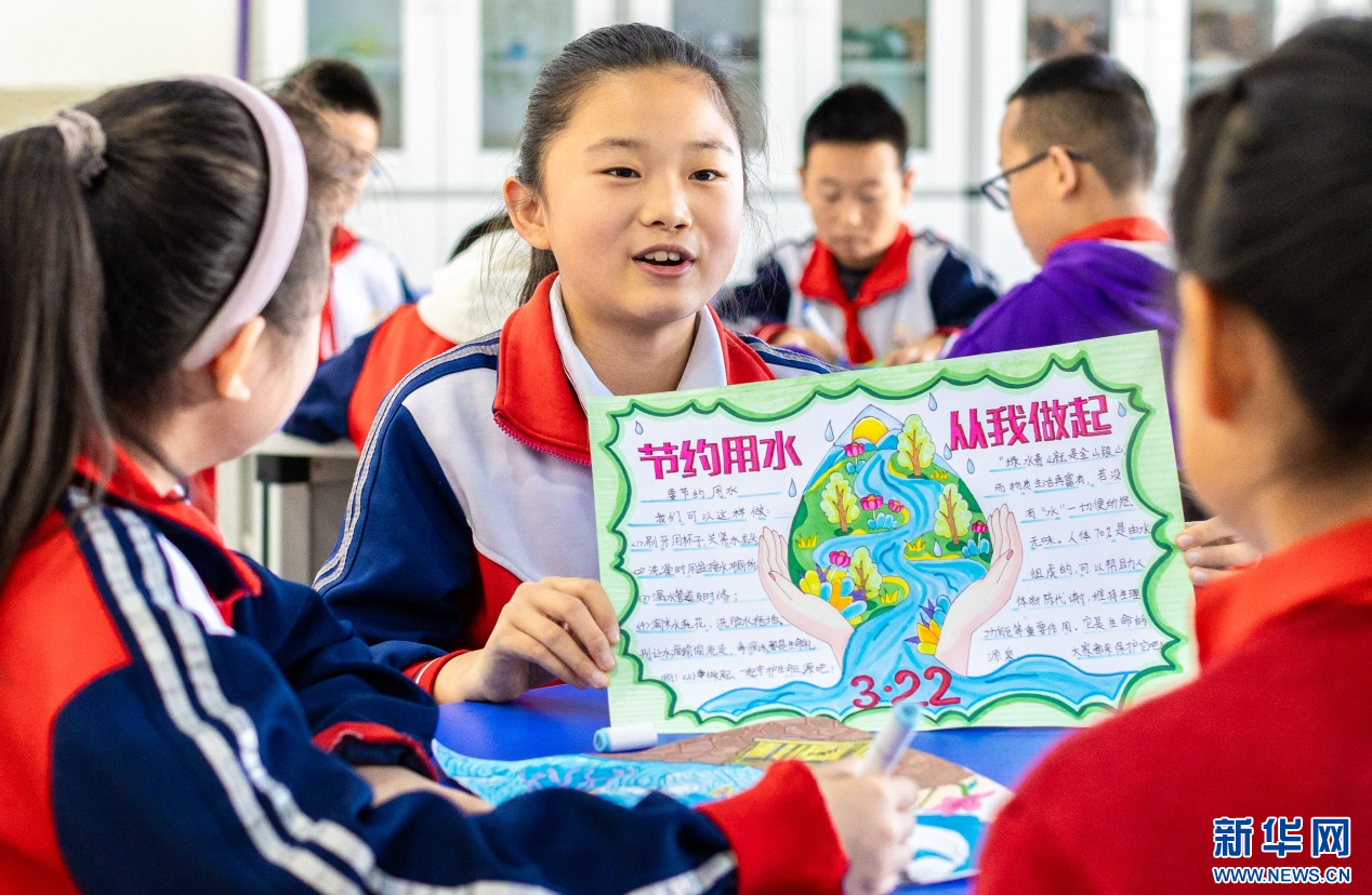??3月20日,呼和浩特市玉泉區(qū)石東路小學學生在繪制以“節(jié)約用水 從我做起”為主題的手抄報。新華網(wǎng)發(fā)(丁根厚 攝)
