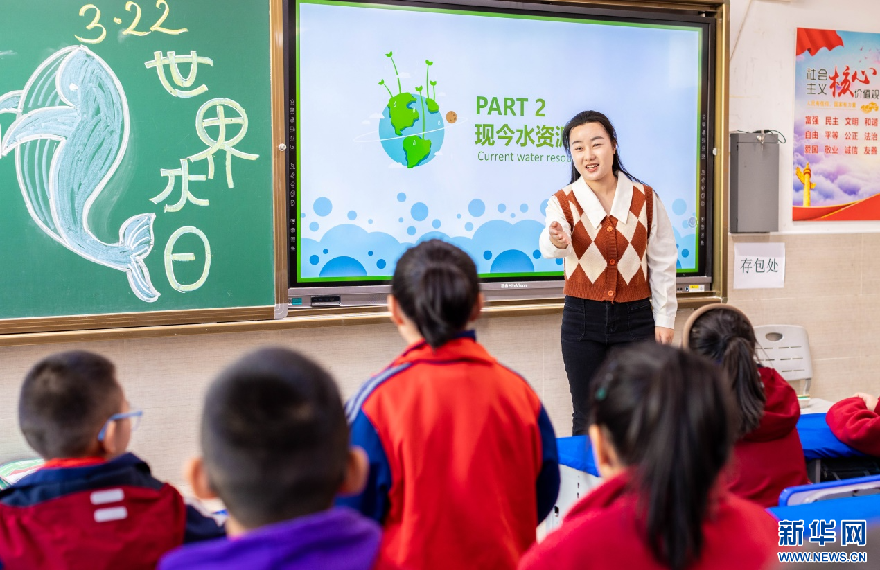 ??3月20日,呼和浩特市玉泉區(qū)石東路小學老師向?qū)W生們講解水資源現(xiàn)狀等知識。新華網(wǎng)發(fā)(丁根厚 攝)
