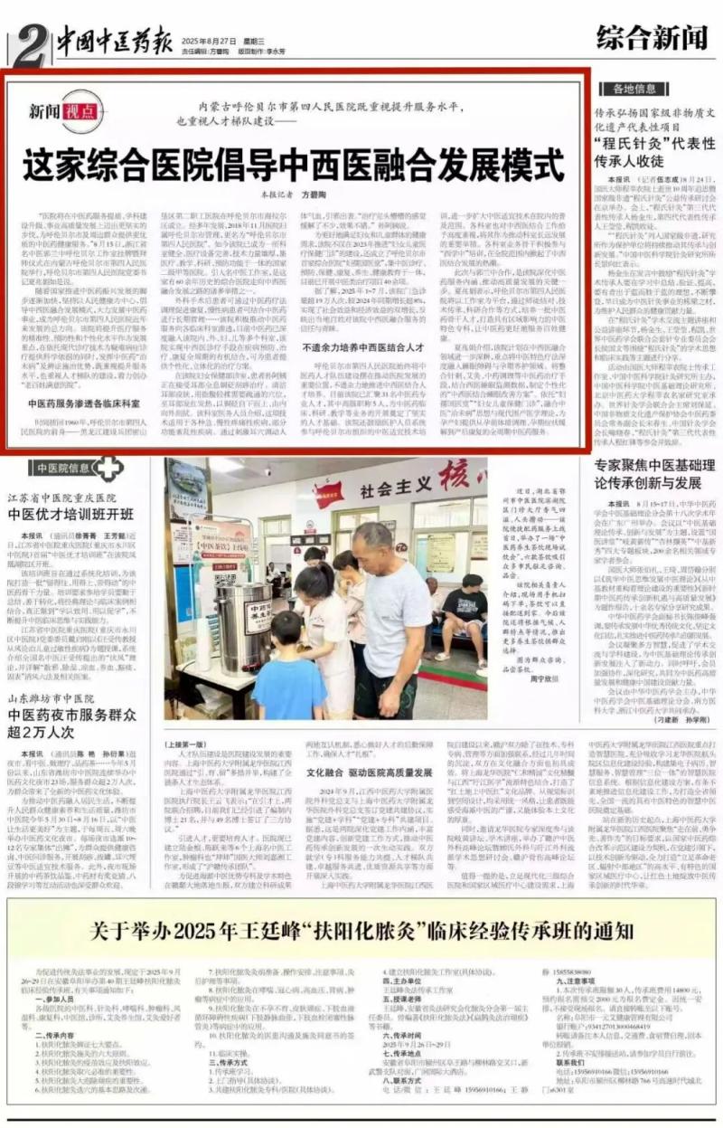 近日,呼倫貝爾市第四人民醫(yī)院傳來(lái)喜訊,其探索實(shí)踐的中西醫(yī)融合發(fā)展模式,登上國(guó)家級(jí)權(quán)威媒體《中國(guó)中醫(yī)藥報(bào)》2025年8月27日第二版重要版面。這不僅是對(duì)醫(yī)院發(fā)展成果的高度肯定,更為地區(qū)醫(yī)療事業(yè)高質(zhì)量發(fā)展注入強(qiáng)勁動(dòng)力。