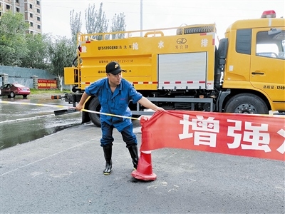 在這之前,通遼市排水管理處已啟動應(yīng)急預(yù)案,搶險人員及應(yīng)急搶險車輛陸續(xù)就位。負(fù)責(zé)明仁立交橋排水搶險的第2小組的4名成員兵分兩路,需要勸退東、西兩側(cè)準(zhǔn)備過橋的汽車司機(jī)和行人,以及排布車輛、施拉警界線……橋西邊,污水管道維護(hù)隊車隊隊長張再智邊忙著手里的活兒,邊通過對講機(jī)呼叫副隊長盛博,催促他趕緊向過往的車輛及行人喊話,提醒大家橋下水深不能通行。此時,盛博已駕車由西向東行至立交橋南側(cè)的輔路上,雨水遮住了視線,雨刮器速度越來越快,他邊回應(yīng)張再智,邊放慢車速向人們喊話。
