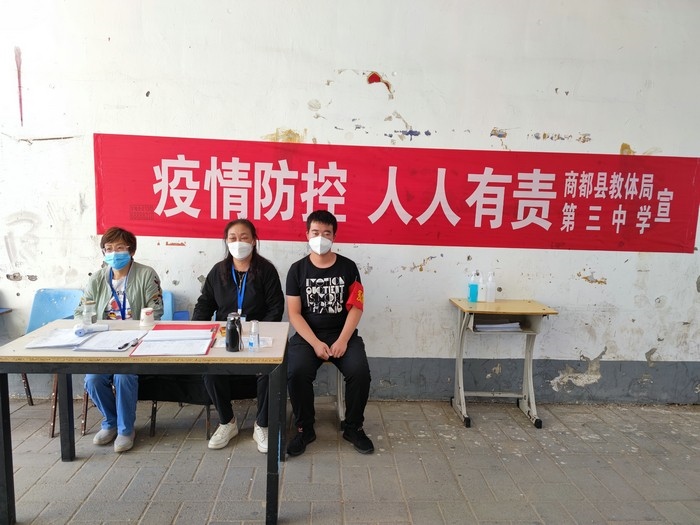 在學(xué)校站在三尺講臺,拿起書本,面向孩子,他們是一名光榮的人民教師。走上抗疫一線,穿上白底藍邊的防護服,拿起測溫儀,他們是一名光榮的抗疫防疫工作者。以師者擔(dān)當(dāng),同心戰(zhàn)“疫”,眾志成城,商都必勝!