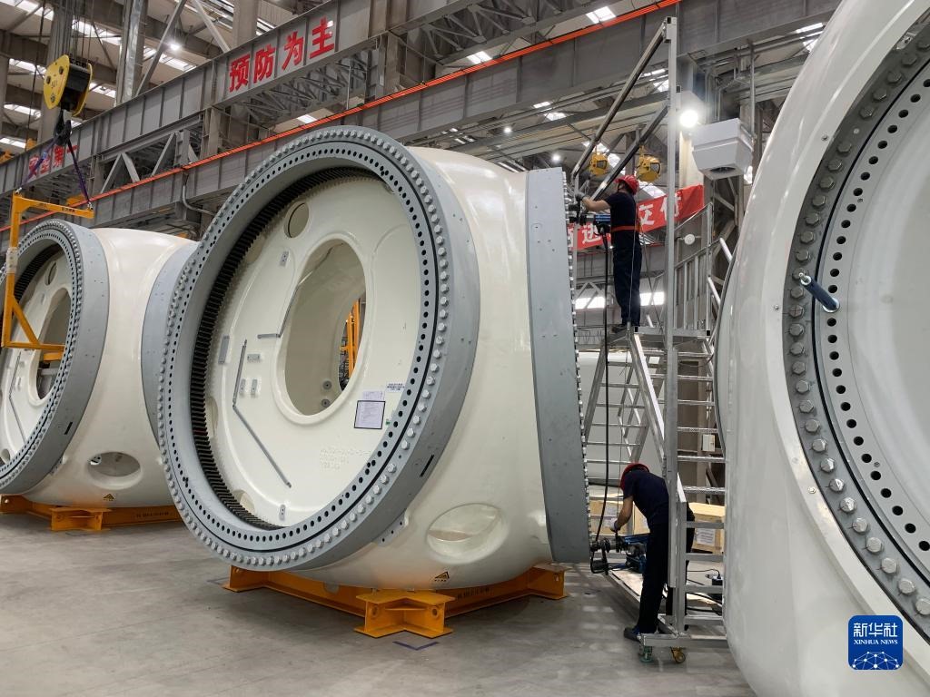“公司2020年12月在烏蘭察布市注冊成立,今年5月中旬建成投產(chǎn),如今已具備每天生產(chǎn)2臺套風(fēng)機(jī)的生產(chǎn)能力?!痹跒跆m察布運(yùn)達(dá)風(fēng)電有限公司的生產(chǎn)車間里,公司副總經(jīng)理常偉指著一臺正在組裝的風(fēng)機(jī)說,“我國風(fēng)機(jī)研發(fā)能力及技術(shù)水平正逐年向國際水平靠攏,曾經(jīng)風(fēng)機(jī)的單機(jī)容量只有750千瓦,目前我們車間里生產(chǎn)的風(fēng)機(jī)單機(jī)容量已超過6000千瓦。”