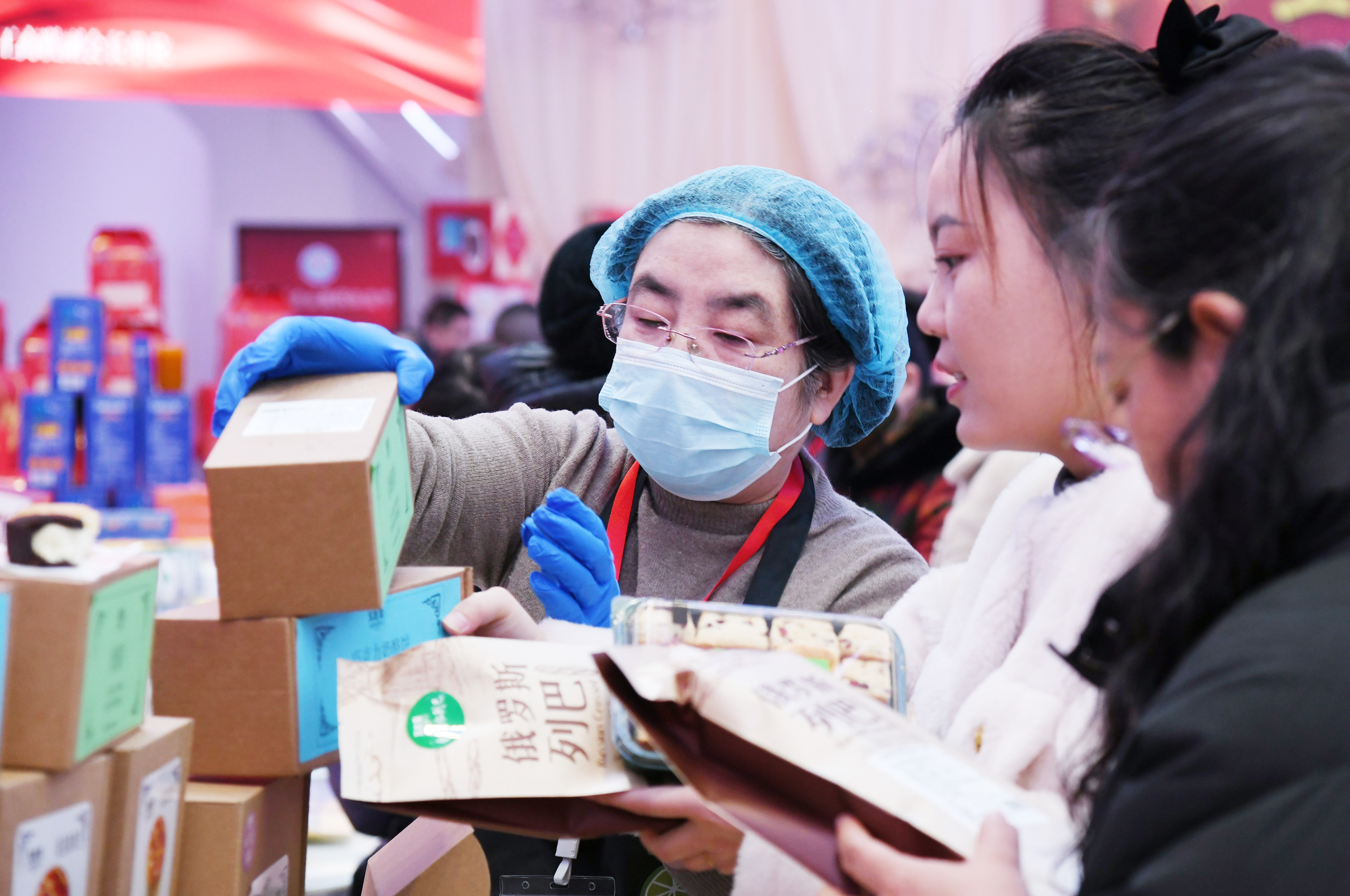 紅毯鋪地、燈籠高掛,熙熙攘攘的人群中,商家的吆喝聲此起彼伏。展位上,散發(fā)著誘人香氣的熟食禮盒、各式各樣的堅(jiān)果奶食、豐富多樣的非遺制品……品類齊全的年貨商品整齊擺放。展位前,擠滿了購買年貨的顧客,大家走走停停、挑挑揀揀,認(rèn)真挑選著心儀的產(chǎn)品,感受著家門口濃濃的“年味”。
