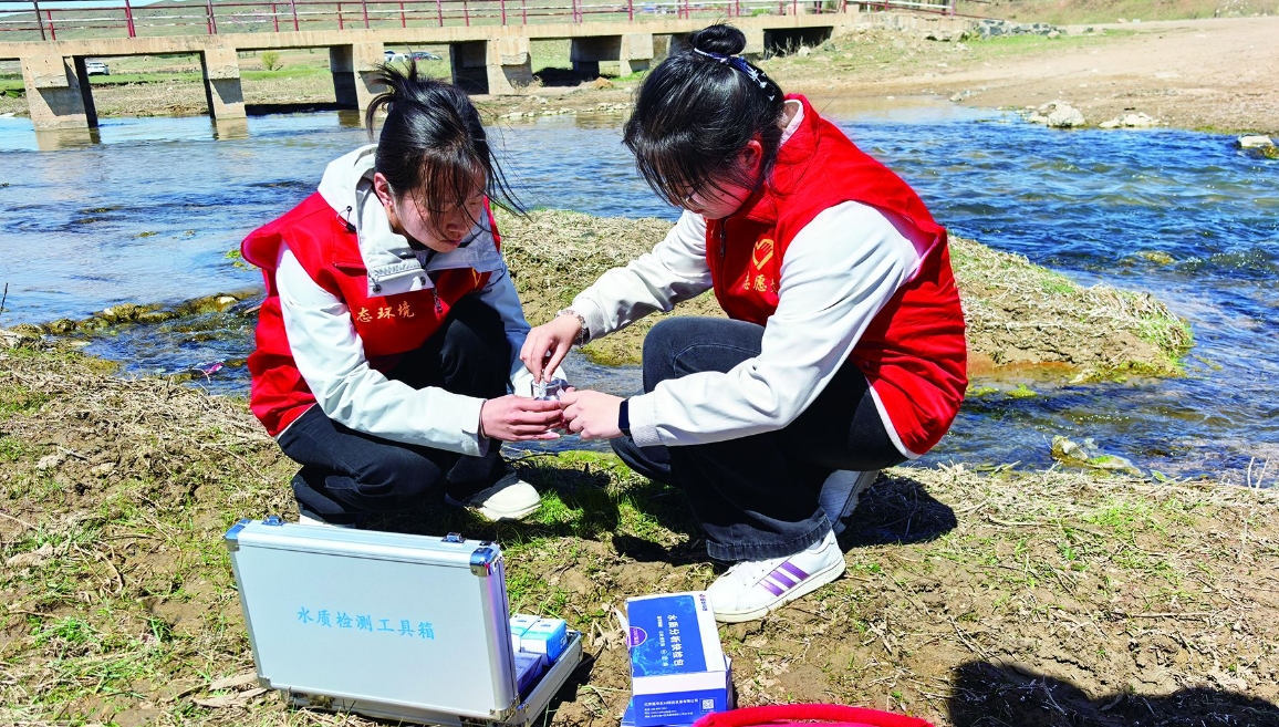 志愿者們用專業(yè)檢測設(shè)備開展水質(zhì)檢測工作 馬佳敏 攝
