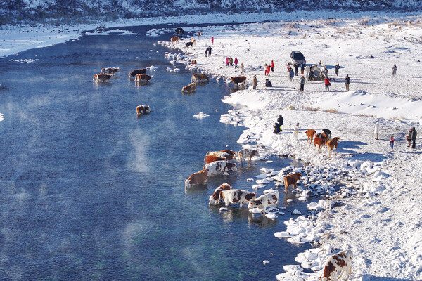 冬日的阿爾山國(guó)家森林公園不凍河,在陽(yáng)光的照耀下輕盈的霧氣裊裊升起,悠閑的牛群在河中咀嚼著鮮美的水草。而那些露出水面的石頭,在寒冷的空氣中被霜花覆蓋如帽,毛茸茸、一團(tuán)一團(tuán)的霜花散落在水中。這如詩(shī)如畫(huà)的景象,吸引了眾多游客前來(lái)觀賞。他們紛紛駐足河岸,拿出相機(jī)和手機(jī),競(jìng)相捕捉稍縱即逝的美好瞬間。(記者 畢力格 攝)