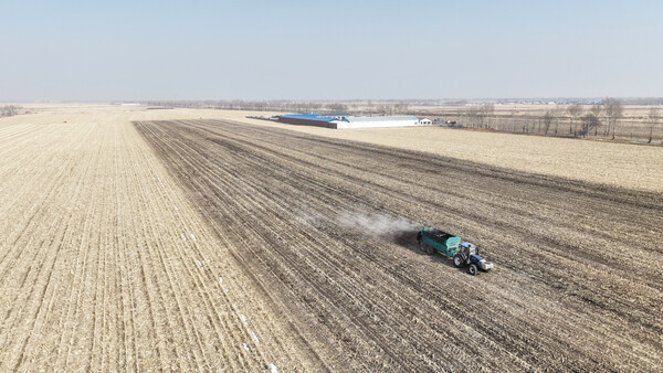 3月8日,農(nóng)民駕駛農(nóng)機(jī)在內(nèi)蒙古興安盟扎賚特旗音德?tīng)栨?zhèn)巨寶村一處農(nóng)田中拋撒有機(jī)肥(無(wú)人機(jī)照片)。驚蟄節(jié)氣后,內(nèi)蒙古興安盟扎賚特旗各項(xiàng)備耕工作有序推進(jìn)。扎賚特旗是我國(guó)重要的產(chǎn)糧大縣,2024年糧食總產(chǎn)量達(dá)49.5億斤。(新華社記者 貝赫)
