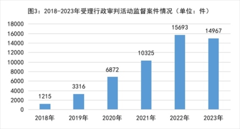 3.行政審判活動監(jiān)督更有實(shí)效。2018年以來受理行政審判活動監(jiān)督案件分別是:2018年1215件、2019年3316件、2020年6872件、2021年10325件、2022年15693件,年均增加89.6%。經(jīng)過連續(xù)五年監(jiān)督,監(jiān)督效果初步體現(xiàn)。2023年共受理14967件,同比下降4.6%。其中,依職權(quán)受理占95.5%;依申請受理占4.5%。針對超期立案、超期審理、違反規(guī)定送達(dá)法律文書等審判程序違法問題,向法院提出檢察建議13491件,同比下降6.8%。