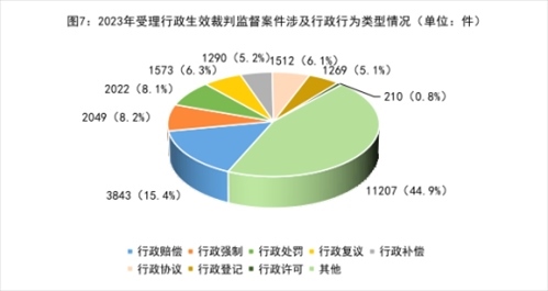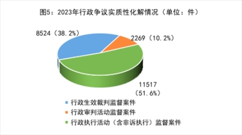 5.行政爭議實(shí)質(zhì)性化解持續(xù)深化做實(shí)。針對司法實(shí)踐中一些行政案件程序已結(jié)但訟爭未解的“程序空轉(zhuǎn)”“案結(jié)事不了”等問題,2023年共促進(jìn)案涉行政爭議實(shí)質(zhì)性化解22310件,同比上升26%。其中,行政生效裁判監(jiān)督案件8524件,占38.2%;行政審判活動監(jiān)督案件2269件,占10.2%;行政執(zhí)行活動(含非訴執(zhí)行)監(jiān)督案件11517件,占51.6%。