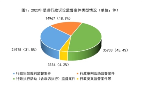 1.行政檢察監(jiān)督職能全面發(fā)展。一方面,訴訟內(nèi)監(jiān)督進(jìn)一步強(qiáng)化。2023年全國檢察機(jī)關(guān)共受理行政訴訟監(jiān)督案件79209件,其中,行政生效裁判監(jiān)督案件24975件,占比31.5%;行政審判活動監(jiān)督案件14967件,占比18.9%;行政執(zhí)行活動(含非訴執(zhí)行)監(jiān)督案件35933件,占比45.4%;行政類案監(jiān)督等案件3334件,占比4.2%。另一方面,“訴訟外”監(jiān)督實(shí)現(xiàn)新突破。2023年辦理行刑反向銜接案件中對被不起訴人應(yīng)受行政處罰的提出檢察意見11.3萬人,辦理行政違法行為監(jiān)督案件提出檢察建議3.2萬件。行政檢察各項(xiàng)職能發(fā)展更加全面、更加協(xié)調(diào)。針對行政訴訟、行政執(zhí)法和執(zhí)行活動存在的問題,以抗訴、檢察建議等方式提出監(jiān)督意見17.4萬件。