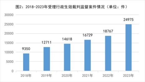 1.依申請監(jiān)督的行政生效裁判監(jiān)督案件數(shù)量逐年上升,反映出人民群眾對檢察監(jiān)督的更高需求。2018年以來當(dāng)事人不服法院生效裁判向檢察機(jī)關(guān)申請監(jiān)督的案件分別是:2018年8697件、2019年11643件、2020年12933件、2021年14995件、2022年17186件、2023年22602件,年均增加21%。2023年16個(gè)省級檢察院受理行政案件數(shù)超過民事案件。當(dāng)事人對裁判結(jié)果申請監(jiān)督的同時(shí),很多情況下還對審判和執(zhí)行程序一并主張?jiān)V求,追求“看得見”的公平正義。