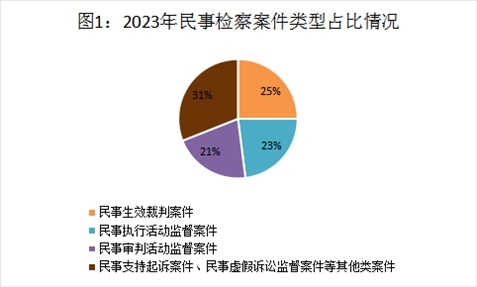 2023年,全國檢察機(jī)關(guān)民事檢察監(jiān)督規(guī)模進(jìn)一步擴(kuò)大,全流程監(jiān)督格局逐步完善,總體發(fā)展保持均衡態(tài)勢。全年共受理各類民事檢察案件33.29萬件,案件數(shù)量持續(xù)上升。其中,民事生效裁判案件占受理總數(shù)的25%,民事執(zhí)行活動(dòng)監(jiān)督案件占23%,民事審判活動(dòng)監(jiān)督案件占21%,民事支持起訴案件、民事虛假訴訟監(jiān)督案件等其他類案件占31%。