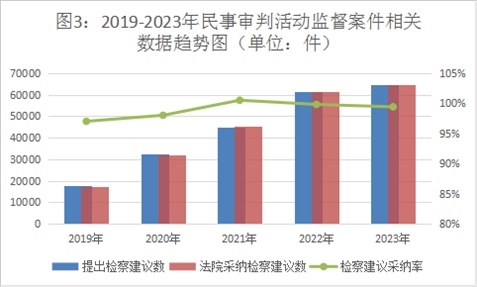 2023年,全國檢察機(jī)關(guān)共受理民事審判活動(dòng)監(jiān)督案件6.94萬件,同期審結(jié)6.96萬件(含積存)。提出檢察建議6.47萬件,同比上升5.1%,占審結(jié)案件數(shù)的93%,同比增加4.2個(gè)百分點(diǎn)。對提出的檢察建議,法院同期采納6.46萬件,檢察建議采納率達(dá)99%。一些地區(qū)通過開展專項(xiàng)監(jiān)督,加強(qiáng)辦案力度,提高辦案效果,推動(dòng)民事審判活動(dòng)監(jiān)督向深層次違法監(jiān)督轉(zhuǎn)變。