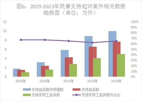 一是民事支持起訴數(shù)量上升較快。2023年,全國檢察機(jī)關(guān)共受理民事支持起訴案件10.14萬件,同比上升13.9%,審查后支持起訴7.73萬件,其中支持農(nóng)民工起訴5.08萬件。從案件類型上看,主要以勞動(dòng)爭議(占43.9%)、合同糾紛(占33%)、婚姻家庭糾紛(占6.7%)為主。