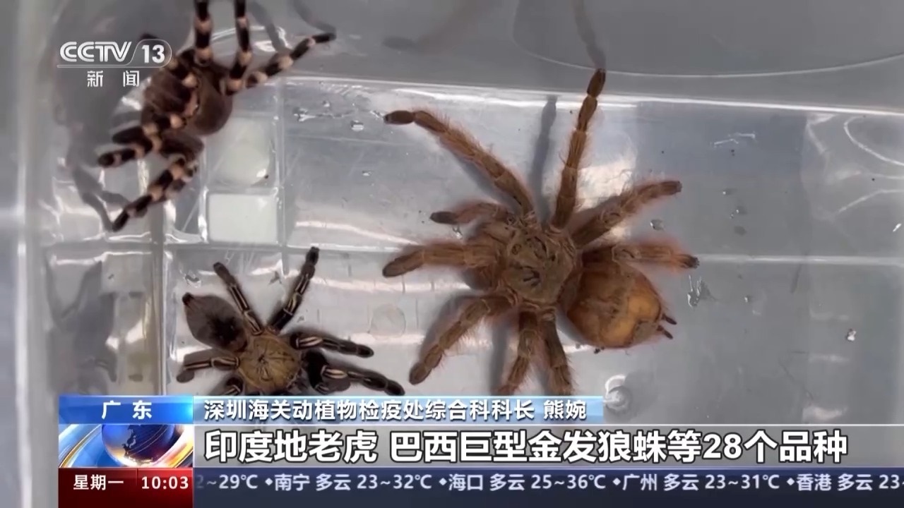 深圳海關(guān)動植物檢疫處綜合科科長 熊婉:查驗關(guān)員在對轉(zhuǎn)運快件開展監(jiān)管時,發(fā)現(xiàn)一票申報品名為“相機(jī)三腳架”的快件包裹機(jī)檢圖像異常,不符合相機(jī)三腳架的圖像特征,隨后進(jìn)行了開包查驗。經(jīng)過專業(yè)機(jī)構(gòu)鑒定,這批活體蜘蛛是墨西哥金背紅尾蛛、印度地老虎、巨人偽鳴蛛、巴西巨型金發(fā)狼蛛等28個品種。