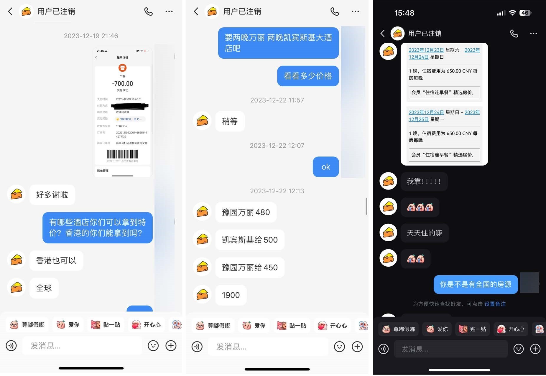 對方了解吳女士訴求后,很快提供了上海多家高檔酒店的折扣信息。吳女士表示,這名博主的報價可以做到“五折”,大幅低于市面上的訂房價格,令其不安。但對方則承諾這些“折扣房”系內(nèi)部價格,有“員工房”“協(xié)議房”或“積分房”等,訂房信息保真,須預(yù)付房費(fèi)且不能通過平臺直接交易。