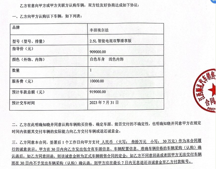 豐田埃爾法汽車,預(yù)計(jì)車款總額91.9萬元,其中車輛指導(dǎo)價(jià)90.9萬元,服務(wù)費(fèi)1萬元,預(yù)計(jì)交車時(shí)間為2023年7月31日。簽訂認(rèn)購合同當(dāng)天,任先生支付了30萬元誠(chéng)意金。