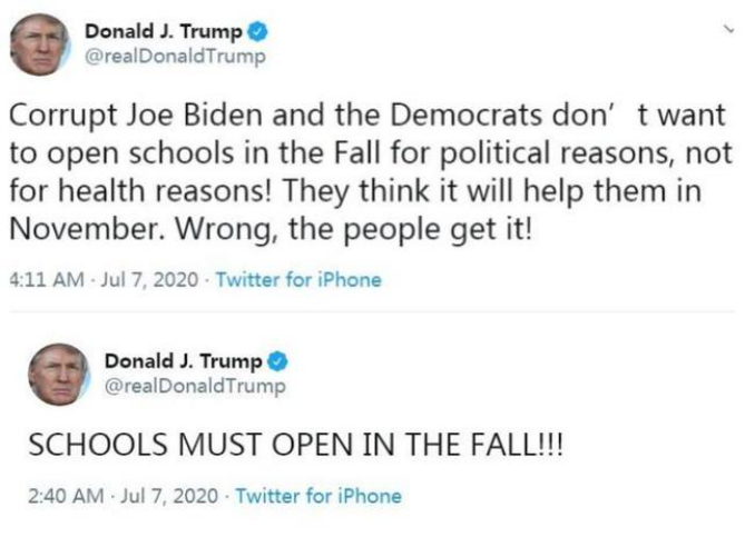 他還在推特上指責,拜登和民主黨人不希望學校秋季復課,是出于政治考慮,而非健康考慮。
