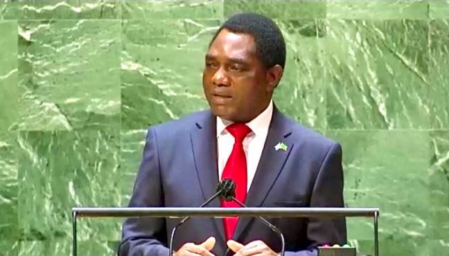 △贊比亞總統(tǒng)希奇萊馬在聯(lián)合國大會(huì)一般性辯論上發(fā)言