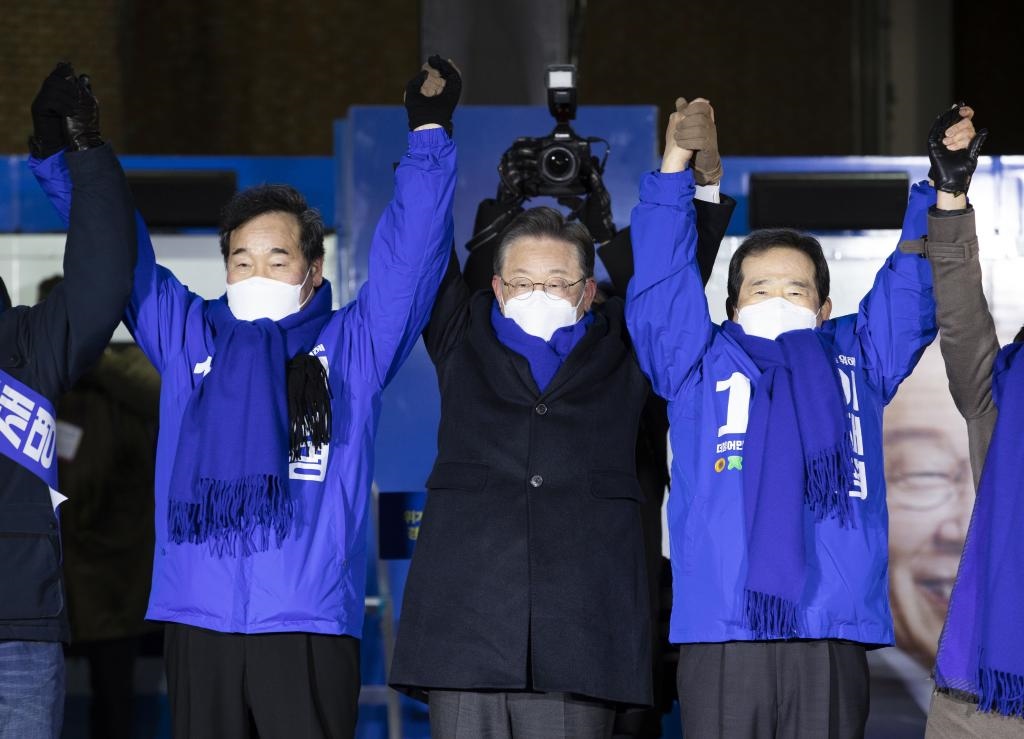 2月15日,候選人李在明(中)在韓國(guó)首爾參加競(jìng)選活動(dòng)。(新華社發(fā),李相浩攝)