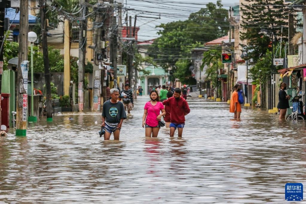 10月30日,人們?cè)诜坡少e甲米地省被洪水淹沒(méi)的街道上前行。新華社發(fā)(烏馬利攝)