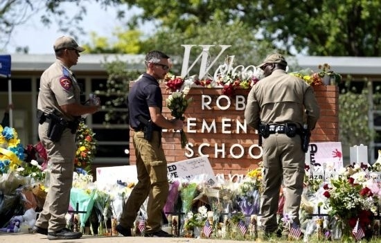 2022年5月27日,警察在美國得克薩斯州南部尤瓦爾迪市發(fā)生槍擊事件的小學外擺放花束。新華社記者吳曉凌攝