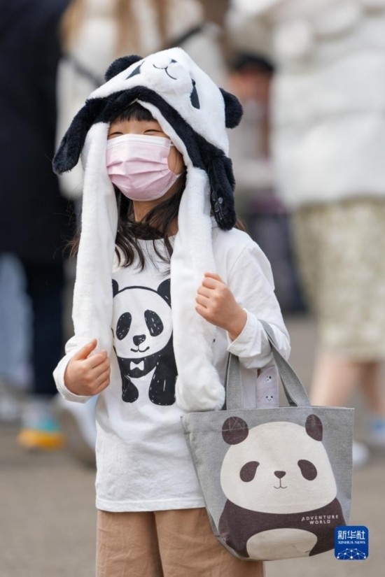 2月19日,在日本東京上野動物園,一名小朋友穿戴著大熊貓服飾游覽。新華社記者 張笑宇 攝
