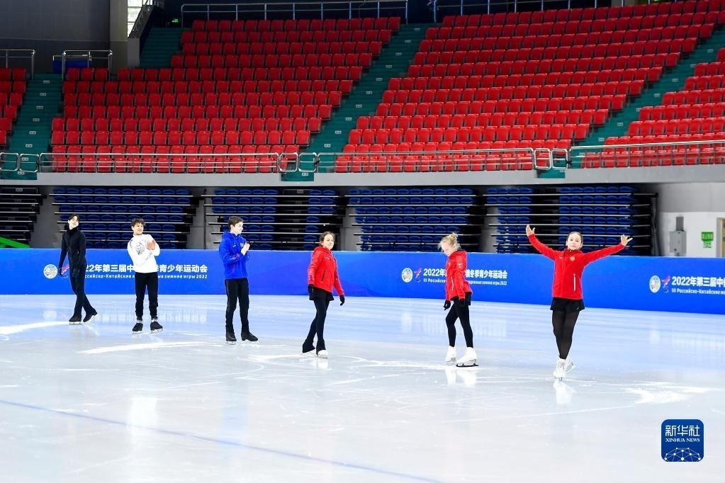在長春五環(huán)體育館,參加第三屆中俄冬季青少年運動會的俄羅斯花樣滑冰運動員在賽前場地適應性訓練時向場邊的中國運動員致意(2022年12月15日攝)。新華社記者 許暢 攝