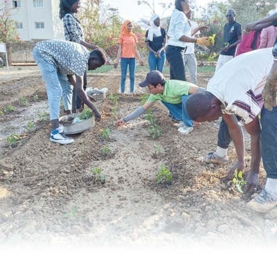 達(dá)喀爾大學(xué)校園里,塞內(nèi)加爾學(xué)生跟著中國老師學(xué)習(xí)移栽辣椒苗。中國援塞內(nèi)加爾農(nóng)技專家組供圖