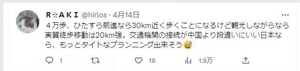 “4萬步,直線距離相當(dāng)于將近30公里,不過如果是徒步邊走邊逛景點(diǎn),差不多是20來公里。如果在公共交通更便利的日本,應(yīng)該能壓縮出一個(gè)更緊湊的行程?!?/p>
