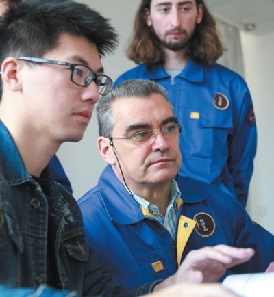 在葡萄牙塞圖巴爾理工學(xué)院魯班工坊,中方教師(左)為葡方師生介紹機(jī)電一體化設(shè)備。 葡萄牙塞圖巴爾理工學(xué)院魯班工坊供圖