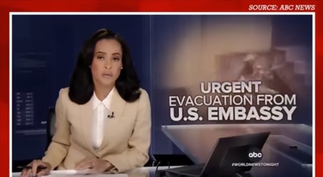(安柏然所發(fā)視頻中,一名美媒主持人報(bào)道美國在夜間出動直升機(jī)撤離美國外交官的畫面。)