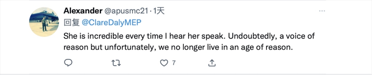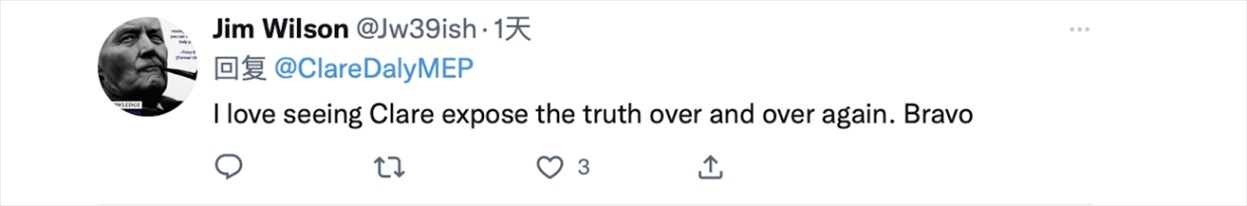 克萊爾·戴利28日在推特上發(fā)布了一條她于19日在歐洲議會全體會議上發(fā)言的視頻,她在視頻上方配文稱,“針對中國可恥的殖民傲慢應(yīng)該留在過去。問題很簡單。我們是想成為我們大西洋朋友的附庸,還是想與我們最大的貿(mào)易伙伴保持和平、獨(dú)立的關(guān)系?這個伙伴40年來沒有向任何人投過一顆炸彈。”