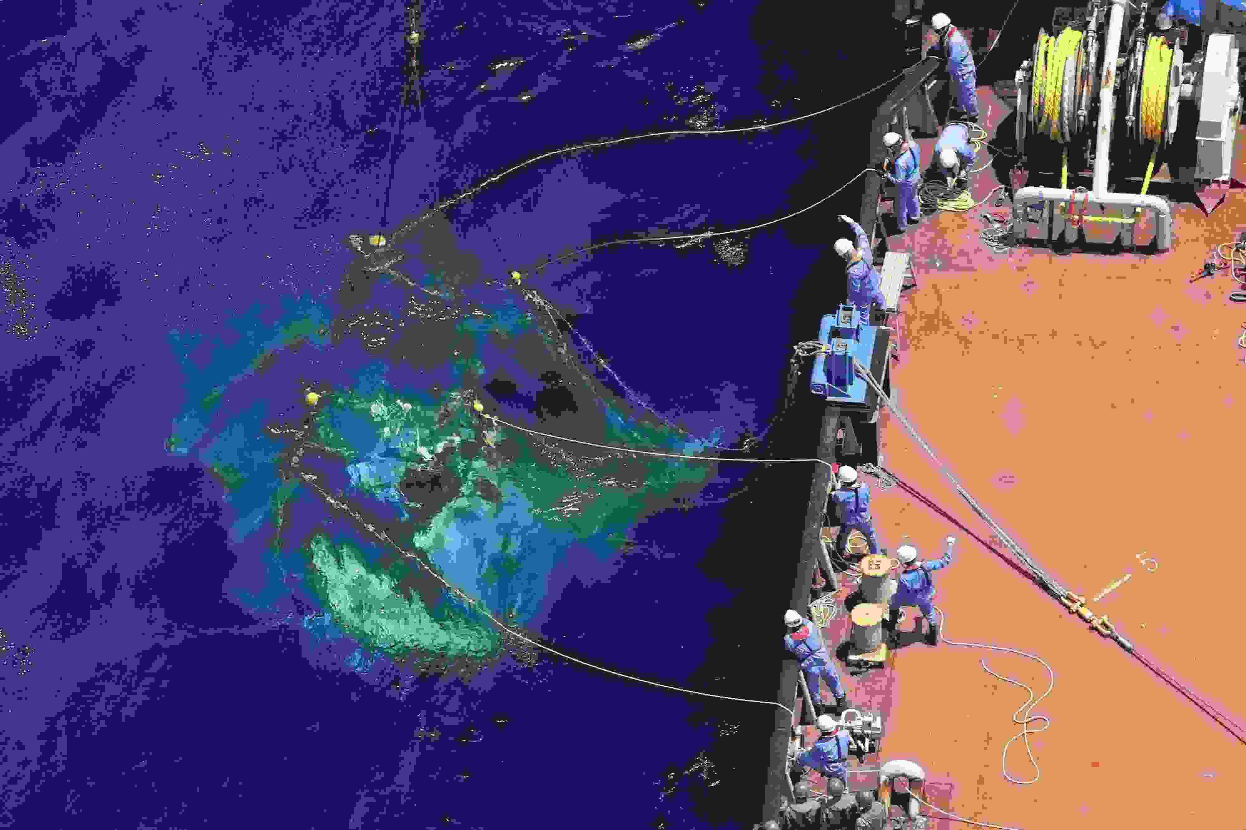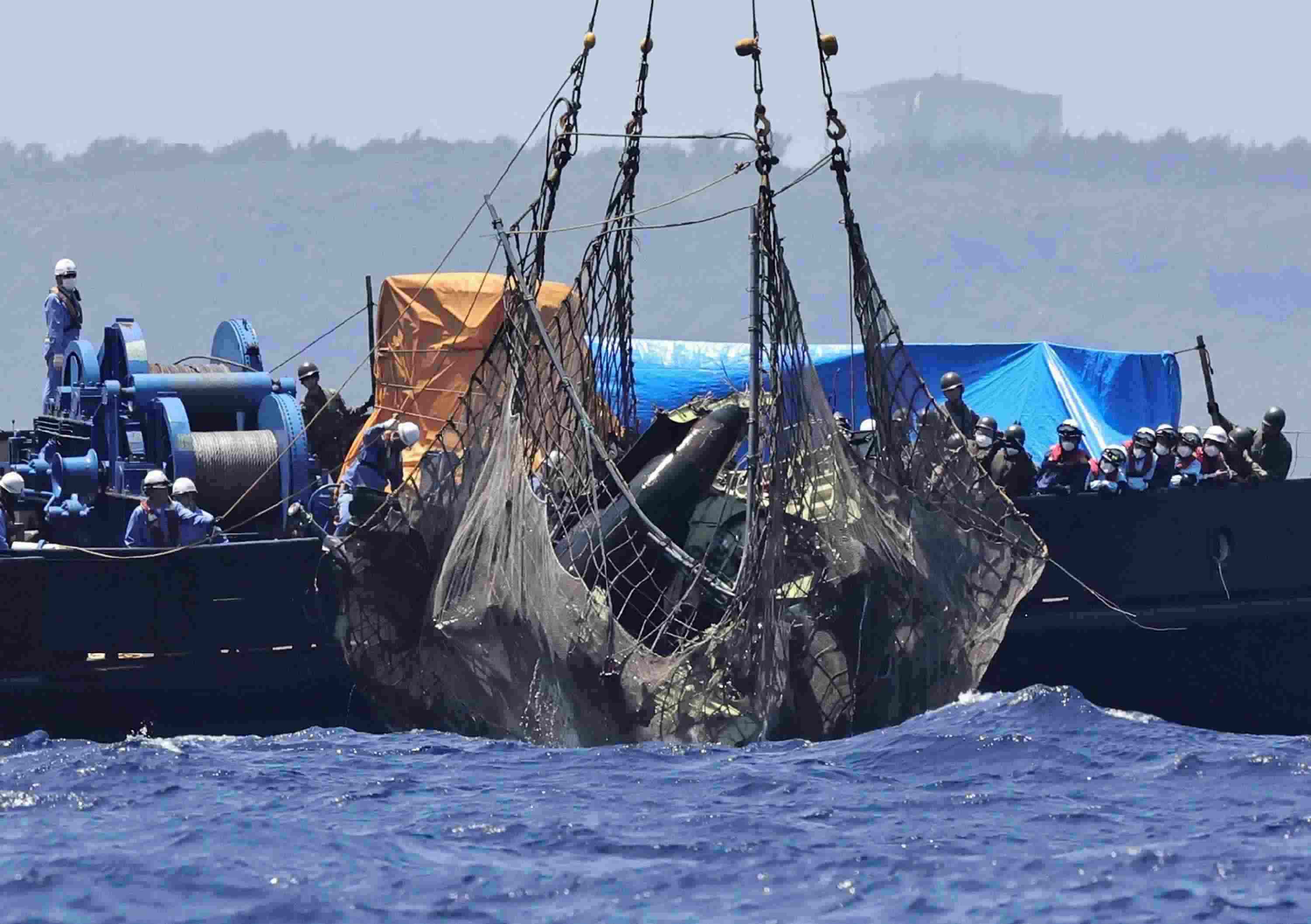 當(dāng)?shù)貢r間2023年5月2日,日本民間作業(yè)船于當(dāng)?shù)貢r間上午11時45分左右,將沖繩縣宮古島附近失事的日本自衛(wèi)隊(duì)直升機(jī)的機(jī)體打撈出海。據(jù)悉,一架日本陸上自衛(wèi)隊(duì)直升機(jī)4月6日在沖繩縣宮古島附近海域失聯(lián),失事直升機(jī)上共載有10人。 視覺中國