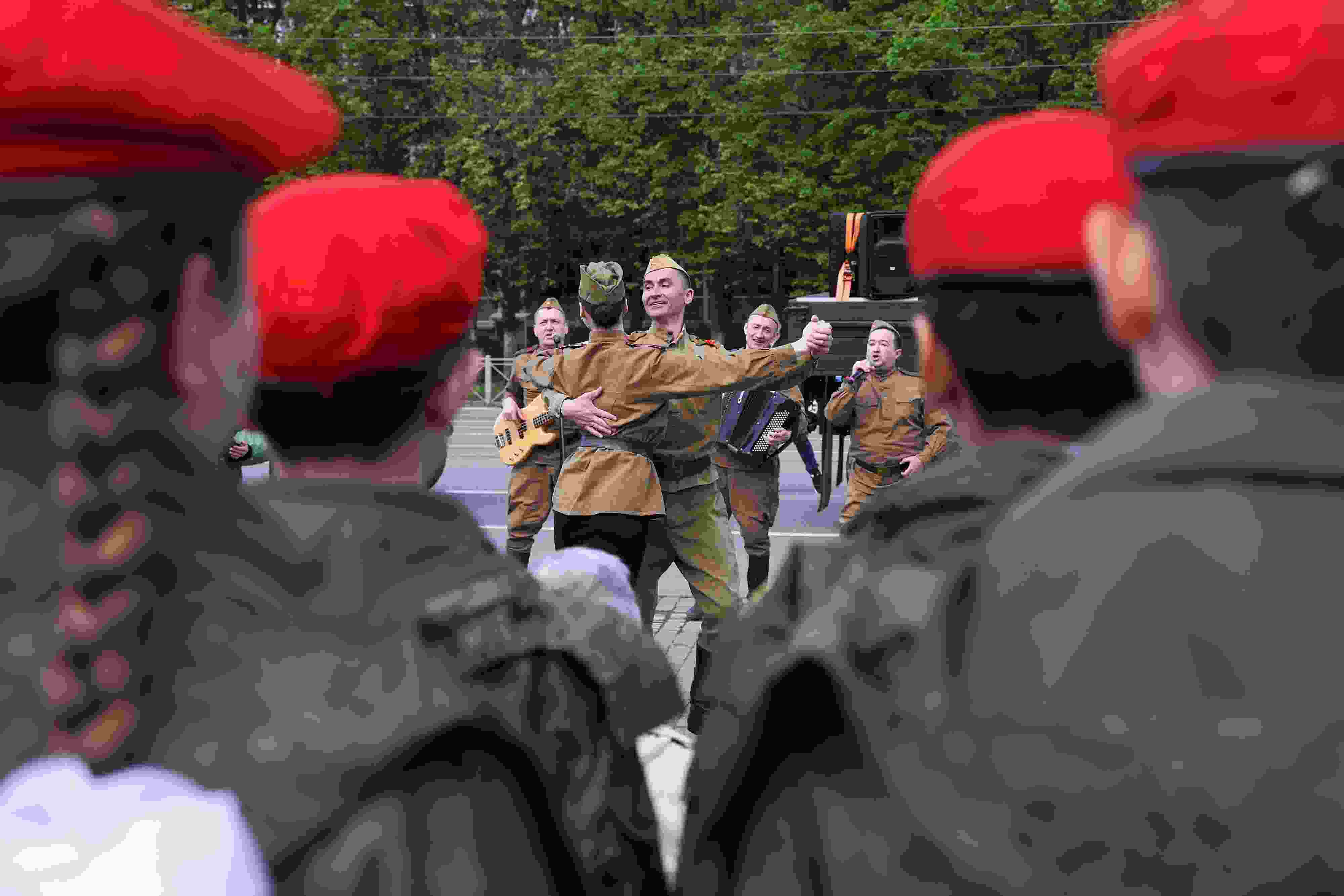 當?shù)貢r間2023年5月8日,俄羅斯莫斯科,人們在紀念二戰(zhàn)勝利78周年的音樂會上表演。蘇聯(lián)解體后,俄羅斯自1995年起,在每年的5月9日舉行衛(wèi)國戰(zhàn)爭勝利日閱兵式及系列慶?;顒?。 視覺中國