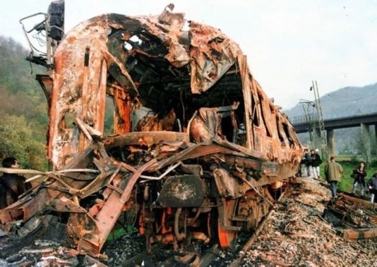 1999年3月24日,以美國為首的北約向南斯拉夫聯(lián)盟開始發(fā)動大規(guī)模空襲,武力干涉科索沃危機(jī)。資料照片顯示被北約飛機(jī)炸毀的火車。新華社發(fā)