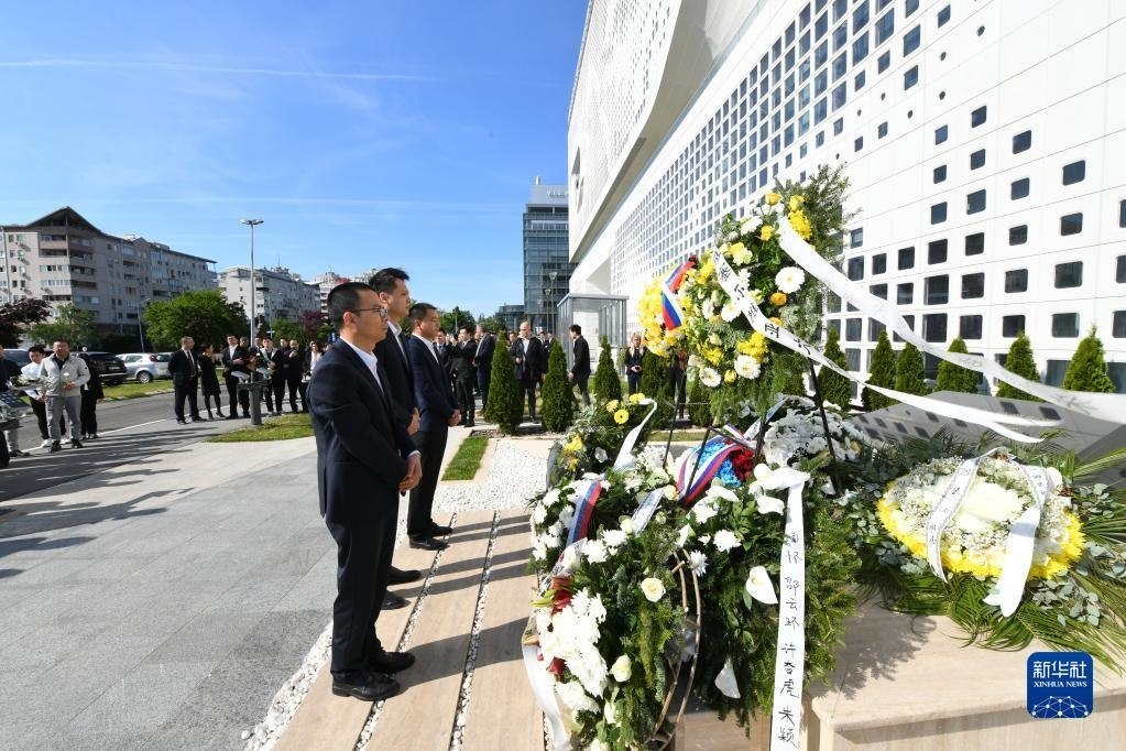 5月7日,在塞爾維亞貝爾格萊德,中資企業(yè)代表在中國駐南斯拉夫聯(lián)盟大使館舊址前的烈士紀念碑前肅立。