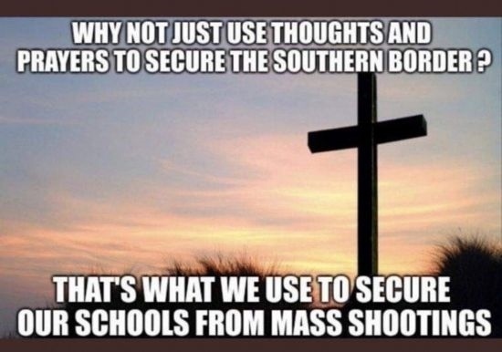 這幅漫畫則諷刺說:“為什么我們不只靠祈禱來阻止非法移民進入美國?我們可是只靠祈禱來保護學校不發(fā)生大規(guī)模槍擊?!?/p>