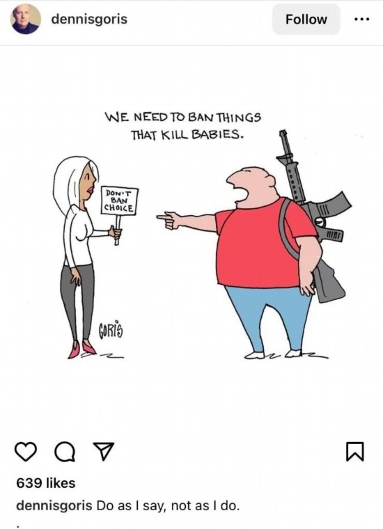 在網友Dennisgoris創(chuàng)作的漫畫中,一名男子指著一名女子說,“我們要禁止殺死嬰兒的政策”,卻無視自己背著的步槍。根據(jù)美國疾控中心等機構數(shù)據(jù),槍支暴力是美國兒童和青少年死亡首要原因。