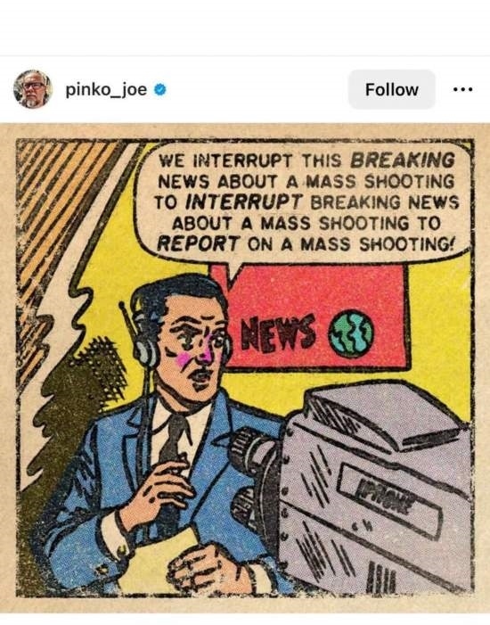 網友Pinko_joe的漫畫主角是一名記者,他對著鏡頭說:“下面讓我們打斷一下關于大規(guī)模槍擊的突發(fā)報道,臨時插播另一條關于大規(guī)模槍擊的突發(fā)新聞!”