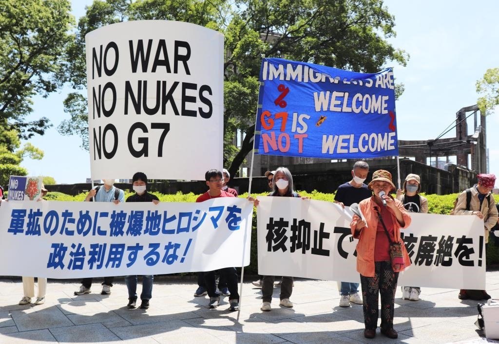 5月14日,在日本廣島街頭,日本民眾舉著“不要戰(zhàn)爭、不要核武器、不要G7”等標語,強烈抗議七國集團(G7)峰會將在廣島召開。新華社記者楊光攝