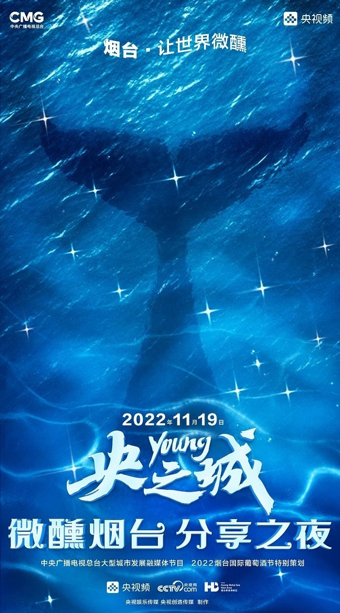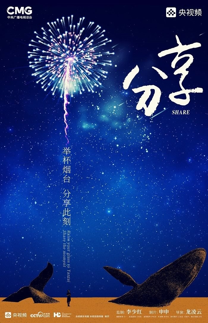 田雨峰在拍攝短片海報(bào)用圖的時(shí)候,首先確定了畫面中最突出的形象元素,同時(shí)也是交代短片故事發(fā)生地的地標(biāo)性雕塑——“孤獨(dú)的鯨“。這個(gè)雕塑如今是煙臺開發(fā)區(qū)金沙灘的網(wǎng)紅打卡地,網(wǎng)友為其起名”鯨落“。碩大的鯨魚從淺海處躍出海面,魚頭和魚尾凌空飛躍,其身體的一部分似藏在沙灘里。這是一個(gè)在真實(shí)生活中不會出現(xiàn)的景象,充滿了動畫般的奇幻想象,位于煙臺碧藍(lán)的海邊,又天然地帶上了一點(diǎn)浪漫的色彩。短片中”舉杯煙臺,分享此刻“的Slogan綴在尾聲,分享的正是煙臺這座城市獨(dú)有的沙灘、夜空、煙火和人間。短片中可以娓娓道來般逐漸交代,但在海報(bào)里,二環(huán)用畫面底部金色沙灘上”孤獨(dú)的鯨“,畫面上方如大海般湛藍(lán)的星空,星空中綻放的煙花,鎖定了地球上唯一的煙臺。田雨峰鏡頭中短片主角的人物照被二環(huán)拼貼到童話般色彩斑斕的畫面里,被著意縮小了的黑色小女孩于是成為一切奇幻、浪漫想象的迸發(fā)之源,和世界分享一個(gè)妙趣橫生的想法。
