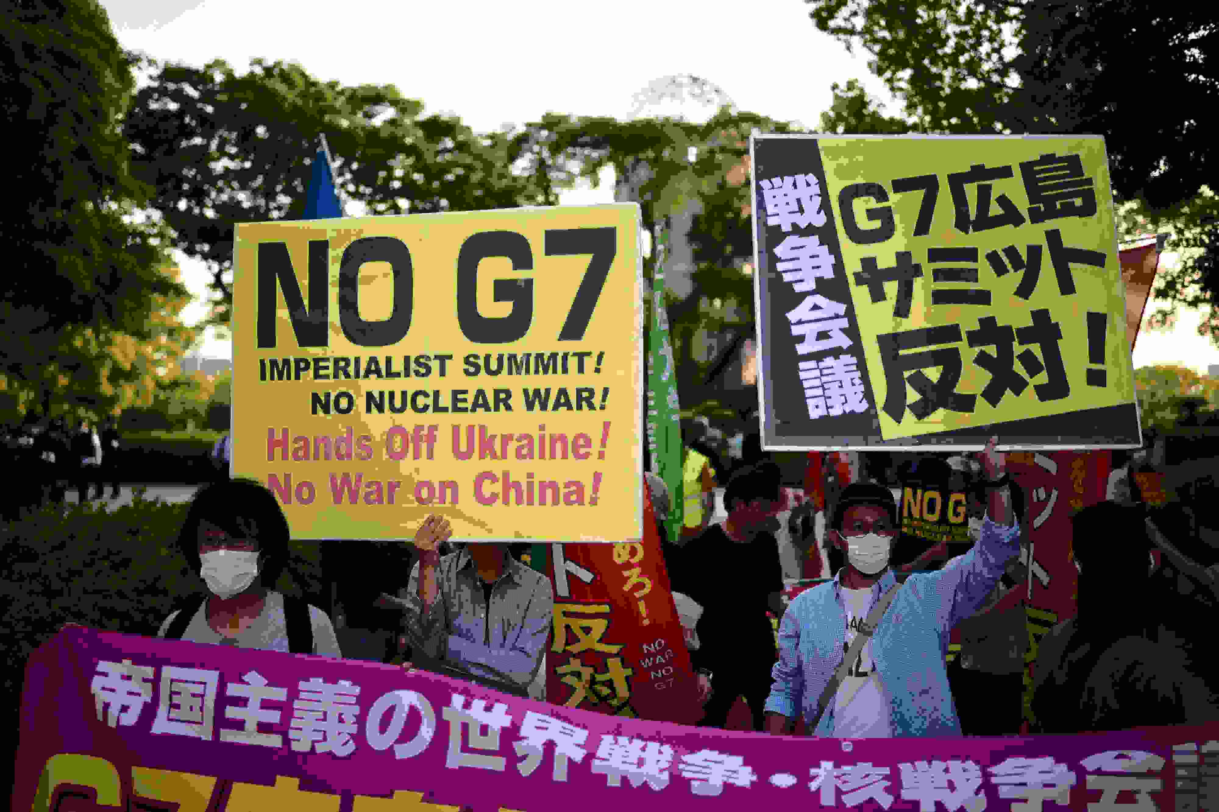 當?shù)貢r間2023年5月17日,日本廣島,日本民眾舉著各式標語,在廣島和平紀念公園原子彈轟炸遺址舉行集會,強烈抗議七國集團(G7)峰會將在廣島召開。 視覺中國