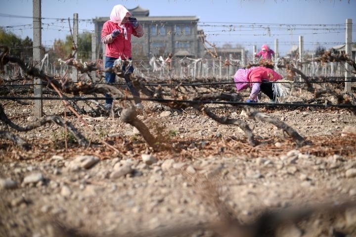 2022年11月5日,在位于寧夏銀川市賀蘭山東麓的藍賽酒莊,農(nóng)民進行埋藤作業(yè)。新華社記者王鵬攝